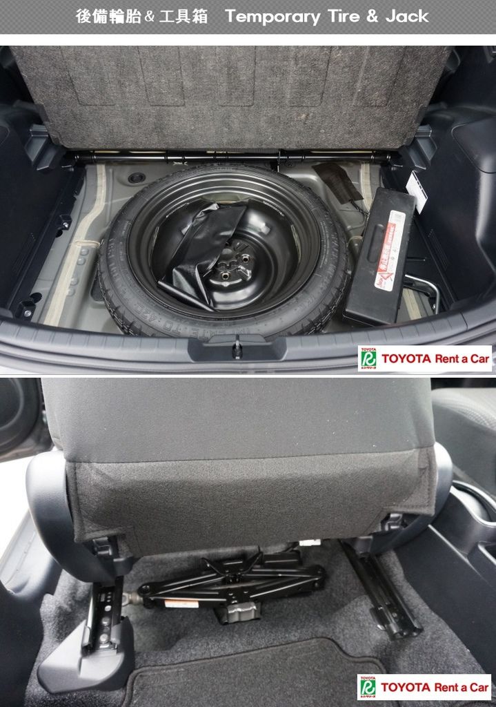 後備輪胎存放在行李箱下段,千斤頂在副座下段。 (拿千斤頂時,把副座推到最前才容易拿取。)