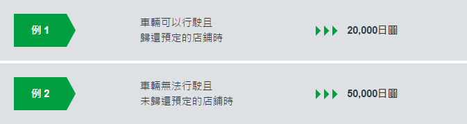注意:租借車輛未返還於店鋪者(例如,在車輛可行駛的情況下置於路邊等),將額外收取50,000日圓